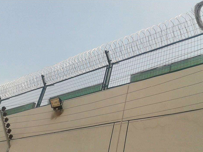 看守所护栏网又称作“Y型安全防御护网”,是由V型支架立柱,加强型焊接片网,安全防盗连接件和热镀锌刀片刺笼组成强度和安全防御性级别很高。现被应用在监狱,军事基地等高安全场所。注:如果在监狱护栏网顶部加装刀片刺丝、刀片刺绳后又很好的增强了安全防护性能。采用电镀、热镀、喷塑、浸塑等防腐形式,具有很好的抗老化、抗晒、耐候等特点。其产品造型美观、花色多样,既起到围栏作用,又起到美化作用。由于具有安全性高、防攀爬能力好,网片连接方式采用特制SBS紧扣件,有效防止人为的破坏性拆卸,横向四道折弯加强筋,使围栏网网面强度显著增加。